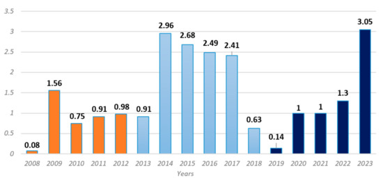 The schedule of emergency housing resettlement in the period from 2008 to 2018, and the planned resettlement from 2019 to 2024 according to the passport of the national project “Housing and Urban Environment” (compiled by the authors based on [9,11,14,15,16]).
