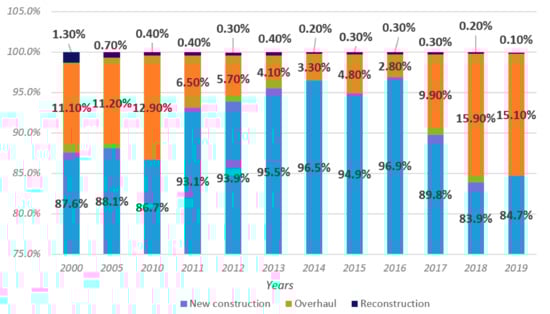 Secondly, the efforts of the authorities towards the relocation of dilapidated housing stopped activities in relation to dilapidated housing and communal service facilities. As a result, a new disproportion appeared in the housing sector: a disproportion among the reproduction forms of capital construction objects. This is manifested in the significant predominance of new construction in comparison to other forms of housing renovation. A huge gap between the forms of reproduction of housing in general has been characteristic of the housing construction market in Russia for a long time. As such, in 2000–2019, in the structure of housing reproduction, the reconstruction of the housing stock accounted for no more than 1.3%, and major repairs accounted for no more than 12.9%, while the share of new construction in housing reproduction was no less than 86.7%. In 2019, in Russia, the share of new construction in the structure of reproduction of the housing stock was 84.7%, major repairs were 15.1%, and reconstruction only made up 0.1% (Figure 3) [9,17,18,19].