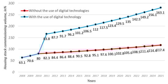 Dynamics and forecast of the housing stock commissioning volume in relation to 2008 with and without the use of digital technologies, as a percentage (calculated by the authors according to [9,50,51,52,53]).