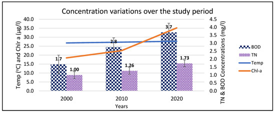 Chl-a showed an increasing trend from 2000, with an annual average of 18.5 µg/L to 35.2 µg/L in 2020. There was a rapid increase in chl-a from 2010 to 2020, which coincided with an increase in TP and other nutrients. The nitrogen-based parameters of TN, nitrate, and ammonia all depicted an increasing trend over the study period (Figure 4 and Figure 5). The annual concentration of TN for the year 2000 was 1.0 mg/L; in 2010, it increased to 1.26 mg/L, while in 2020, the mean annual concentration had reached 1.73 mg/L (Figure 5). The TN variation over the two-decade study period ranged from 0.73 to 2.93 mg/L, with the minimum concentration observed in 2000 and the maximum concentration observed in 2020 (Table 2). The concentration of BOD, which is an indication of organic matter in water, showed an increasing trend (Figure 5). In the 2000s, the concentrations were relatively low at 1.7 mg/L, gradually increasing to 2.8 mg/L in 2010 and eventually reaching 3.7 mg/L in 2020 on average. The range over the study period was 0.9–19.3 mg/L. Water temperature over the study period showed slight annual average increase, from 26.8 °C in 2000 to 27.2 °C in 2010 and eventually 27.7 °C in 2020 (Figure 5).