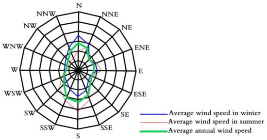 Shenyang is the capital of Liaoning Province, which is the economic, cultural, financial, and commercial center of Northeast China. It is also an important industrial base and a historical and cultural city in China. Shenyang is located in the south of Northeast China (42°21′ N, 123°28′ E), and it has a continental monsoon climate in the north temperate zone. Thus, it is cold in winter and warm in summer. The cold period is long, as spring and autumn are short and windy; the temperature differences between the seasons are also obvious in Shenyang. The annual mean temperature and humidity are 8.1 °C and 63%, respectively. Figure 1 shows the wind map of Shenyang, from which it can be seen that the wind direction is relatively stable all year round and that the maximum wind direction is mainly from the south in summer and north in winter.