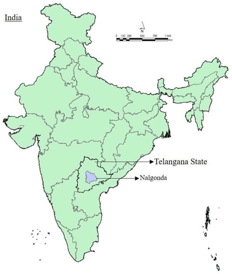 The present study was conducted in the Nandyalagudem, Boringthanda and Kasarabad villages of Atmakoor Mandal in the Nalgonda district of Telangana state in the south-central region of India during the period 2019–2020. The map of the study area is given in Figure 1. More than 80 percent of the state is vulnerable to agricultural drought in the changing climate scenario and the study district is one of the extreme drought prone districts of the state. The study location was selected due to its vulnerability to frequent droughts, and the district identified on a scientific analysis based on exposure, sensitivity and adaptive capacity in relation to climate change under the NICRA program, to implement the TDC component for establishing the climate resilient village (CRV). The major vulnerability addressed in the study villages was drought and erratic rainfall [,,]. The district comes under the NARP zone—southern Telangana Zone (AP_4) (Figure 1) and the average rainfall of the study area is 750–850 mm, wherein interventions against drought and prolonged dry spells were witnessed. Out of the total cropped area of 300 ha, 80% is under rainfed crops and the major crops grown are cotton, pigeon pea and rice.