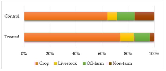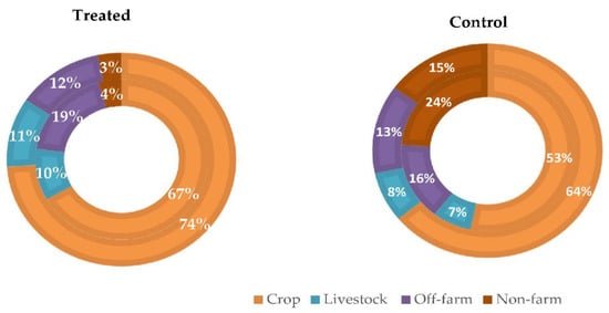 A farm household receives income from major sources such as crop cultivation, livestock rearing, labor and other non-farm activities such as business, tailoring, shops, etc. A typical dryland farm family receives its income from activities such as crops, livestock, non-farm labor and off-farm income. Sources of income from crops include cultivation of cereals, pulses, oilseeds, fibers, sugarcane, commercial crops, fruits, vegetables, etc.; non-farm includes wages received from working on other fields in the village or nearby village; livestock includes income from dairy, poultry, sheep and goats; non-farm income includes income from small businesses, shops, construction works, tailoring, automobile repair shops, etc. The major share of income for a farm household (Figure 2) was by crops cultivated in both the treatment (74%) and control village (64%), followed by income from off-farm activities (12% and 13%) and livestock rearing (11% and 8%). When we compare the treatment and control villages, it is evident that income from agricultural activities had a major share in total farm incomes where climate resilient strategies were adopted. The respondents in the control village received about 15% of their income from other non-farm activities. The average income of the treatment village was Rs. 236,191/year while in the control village the income was Rs. 193,916/year, with a percentage increase of 21.8 percent over the farm households in the control village.