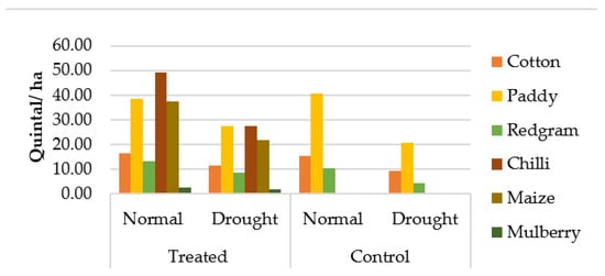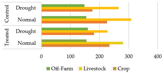 The data on the productivity of crops, employment days and income of farmers during drought and normal years are presented in Figure 3, Figure 4 and Figure 5. The changes in crop production and productivity are one of the most evident impacts of extreme weather events [,,,,]. The data on the productivity of crops, employment days and income of farmers during drought and normal years are presented in Figure 3, Figure 4 and Figure 5. Irrespective of the crops grown, the effect of drought was evident in the reduction in yield especially in the control village. The percentage reduction in yield was highest for chilli (44.35), followed by maize (41.67), mulberry (32.32), red gram (34.70), cotton (30.41) and rice (28.81) in the treatment village. The reduction in yields of cotton and rice was below 40 percent with the highest reduction reported for red gram (58.46) in the control village. The results of the study also found that the employment days of a farmer reduce during a drought compared to a normal year. While looking into the days of employment, farmers reported that employment from crop and livestock activities during droughts reduced by 29 and 23 percent. However, there was an increase in employment days from off-farm activities, which would be because farmers, especially the small and marginal farmers, tend to go as laborers to other farms and nearby villages having access to irrigation. The data from the control village also showed a notable reduction in employment days, including the employment from off-farm activities.