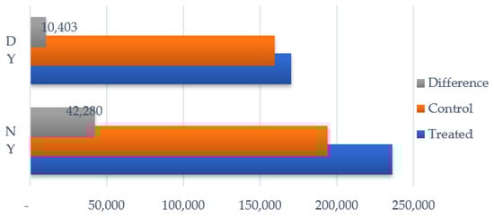 The methodology in estimating causal relationships was widely used since the study by Ashenfelter and Card (1985). The data are collected for two groups for two periods and one of them is the treatment group while the other is the control group. The treatment group receives treatment in one period while the control group receives no treatment during both periods. The average gain over time in the control group is extracted from the gain over time in the treatment group. This double differencing method removes biases arising from permanent differences between these groups, as well as time differences in the treatment group, which can be due to time trends [,,,,]. Here, the change in the farm income of the treatment group compared to the income in the control group measures the treatment effect. The difference in the impact of the NICRA program can be computed from income before the treatment. This difference is called the “first difference.” The same difference in outcomes between the treatment and control groups after the conclusion of the project is called the “second difference”. The DID estimate for the present study has been modified and given below [].