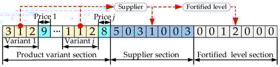 In the above process, chromosome coding is an important foundation of NSGA-II, which aims to express a series of problems as a series of strings [21]. Figure 1 shows an example of the chromosome structure. It can be found that a chromosome structure is composed of three sections: product variant section, supplier selection section and fortified supplier section. For the product variant section, a product variant includes three basic modules, and the number of module instance for the basic modules are 3, 2, 2, respectively. The product variant can be configurated by selecting one module instance from each basic module. The gene fragment information for product variant 1 is compiled as: variant 1 = {M13, M21, M32}, and the value 9 in price 1 represents that the 9th discrete price is selected for product variant 1.