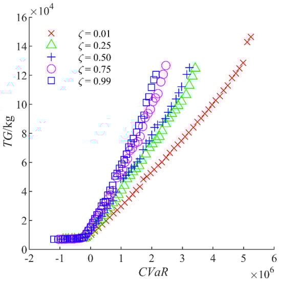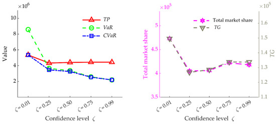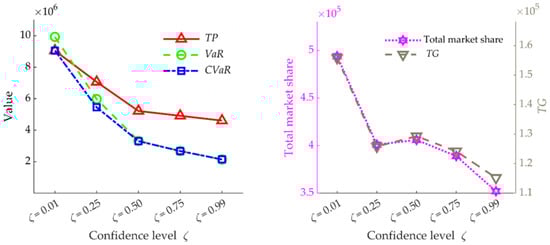 For two different ranges of disruption probability, in addition, the trend of TG curves is the same as that of the total market share curves as shown in Figure 5 and Figure 6. Here, it is worth noting that the above curves each have two turning points. The first turning points are both at ζ = 0.25, and the second turning points are at ζ = 0.75 and ζ = 0.50, respectively. For any of the above curves, when the confidence level is less than the first turning point, the curve drops quickly with the increase in the confidence level; when the confidence level is between the two turning points, the curve rises slightly as the confidence level increases; when the confidence level is greater than the second turning point, the curve again drops with the increase in the confidence level.