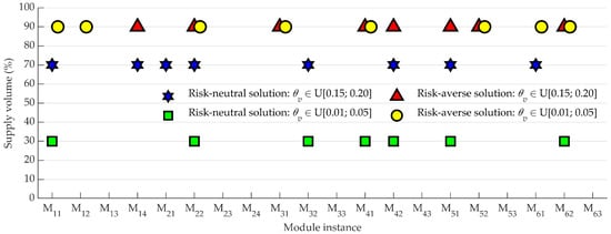 In addition, taking Table 3 and Table 4 together, although the selected module instances are fortified to different levels, it can be found that the worst-case supply volume percentage (i.e., supply volume percentage when the failure occurs) is the same for the selected module instances in each scheme, as shown in Figure 4. For example, for two schemes as shown in Table 3, the worst-case supply volume percentage of all selected module instances are 70% and 30%, respectively; for two schemes as shown in Table 4, the worst-case supply volume percentage of all selected module instances are both 90%. The reason for the above results is that the quantity of product variants is determined by the smallest delivered quantity among all selected module instances (i.e., the delivery bottleneck) in co-decision for PCSS, which is different from the supply chain design for the single component/module.