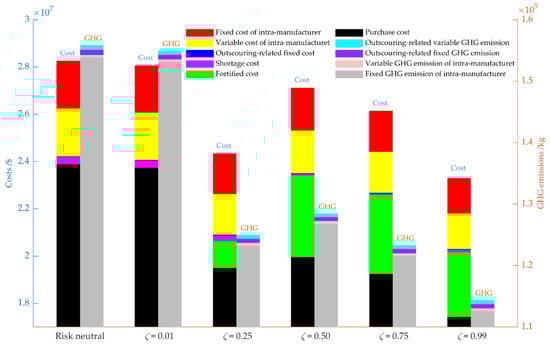 To illustrate the above phenomenon, the costs and GHG emissions, which are obtained by the risk-neutral model and the risk-averse model when obtaining the maximum TP and maximum CVaR, respectively, are shown in Figure 7 when θv ∈ U[0.01; 0.05]. Firstly, it can be found that the fixed GHG emission of the intra-manufacturer and the purchase cost are mainly contributed to TG and the expective total costs (TC), respectively. Moreover, it can be observed that the fluctuations of the fixed GHG emission of the intra-manufacturer, the shortage cost, the fortified cost and the purchase cost are most obvious as the confidence level varied. When ζ < 0.25, the shortage cost and the purchase cost are significantly reduced while the fortified cost gradually grows with the increase of the confidence level. When 0.25 < ζ < 0.50, the fortified cost continues to increase to the peak point while the shortage cost continues to decrease to the valley point, and the purchase cost rebounds slightly. When ζ > 0.75, the purchase cost drops again, and the fortified cost drops slightly while the shortage cost is basically unchanged.