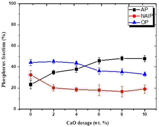 The effects of different CaO weight fractions (0–10 wt%) on the fraction of each P type in the SS are shown in Figure 1. The experiments were performed at 25 °C for 2 h. The SS solid concentration was 40 mL/g. When 2 wt% CaO was added, the fraction of NAIP decreased from 32.5% to 20.2% and that of AP increased from 23.3% to 34.7%. When 6 wt% CaO was added, the fraction of OP decreased from 44.2% to 36.2% and that of AP increased more. When >8 wt% CaO was added, the fractions of NAIP and OP decreased to 16.5% and 35.3%, respectively, whereas that of AP increased further to approximately 50%. These results suggest that when CaO was added at 25 °C, part of the NAIP and OP was converted to AP. Although, AP and NAIP can be leached out by wet chemical method, but OP cannot by wet chemical methods [22]. OP isn’t completely converted to AP or NAIP. Due to OP usually being removed during biological, thermochemical and incineration treatment [16,17,18], OP converted to AP following the application of a further low temperature heat treatment.