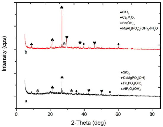 XRD analysis detects the mineralogical crystal phases of inorganic compounds, the results suggest that IP existed as Al, Fe, and Ca compounds in the as-received SS sample. Compounds in which P bonds with Al (such as AlP3O8(OH)2) and Fe (such as Fe4(PO4)3(OH)3) are classified as NAIP, and those in which P bonds with Ca (such as CaMg(PO4)(OH,F)) are classified as AP [14,15,17,40,41]. After the addition of 8 wt% CaO at a high temperature (300 °C) for 2 h, MgAl2(PO4)2(OH)2·8H2O is classified as NAIP. The AP compounds Ca2P2O7 was still detected.