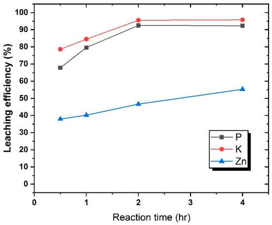 The leaching of P, K, and heavy metals is detailed in Table 5. The efficiencies of P, K, and Zn leaching from SS by using combined organic acid were approximately 78%, 90–95%, and 50% respectively, for a leaching liquid pH of 2.56. The efficiencies of P, K, Cu, Zn, and Cr leaching from SS were all 90–95% when using H2SO4 and a leaching liquid pH of 0.37. The efficiencies of P, K, and Zn leaching from SS by using NaOH were approximately 70%, 65%, and 50% respectively, for a leaching liquid pH of 11.5. Finally, the efficiencies of P and K leaching from the post-conversion SS by using combined organic acid were approximately 90–95%, whereas those of Zn and Cr leaching were 50% and 0.1%, respectively; the leaching liquid pH was 2.56. To further prove that the contents of P and K are high while the contents of Zn are low in combined organic acid, we investigated the effect of reaction time on the leaching of P, K, and heavy metals, results of which are shown in Figure 4. When reaction time is 0.5 h, the leaching efficiency of P, K and Zn is approximately 70%, 80% and 40% respectively. As the reaction time increased, the leaching efficiency is increased so that when the reaction time is 2 h, the leaching efficiency of P, K and Zn is approximately 90%, 90% and 50% respectively. When reaction time is above 2h, the leaching efficiency of Zn is approximately 60%. Accordingly, this result allows us to speculate the priority in which the P and K may be leached out. Thus, the content of P and K is higher than Zn in the combined organic acid solution. The discussion of this result is in Section 4.3.