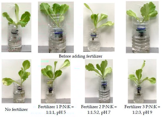 The roots, stems, and leaves of the plants were observed to grow more quickly after the addition of fertilizer. The fertilized plants grew 1–2 new leaves, and the leaf length was observed to increase by 3–5 cm. The branches were also observed to exhibit more luxuriantly. Regardless of the added fertilizer, the plants were observed to have superior growth. However, fertilizers 1–3 with various pH values could be used in soils of different acidity or alkalinity levels. The content of heavy metals in plants with liquid fertilizer for 21 days is shown in Table 6. Whatever kind of liquid fertilizer is applied, the content of heavy metal in the plants for 21 days is in accordance with Taiwanese Food Safety regulations and EU No 420-2011 regulations.