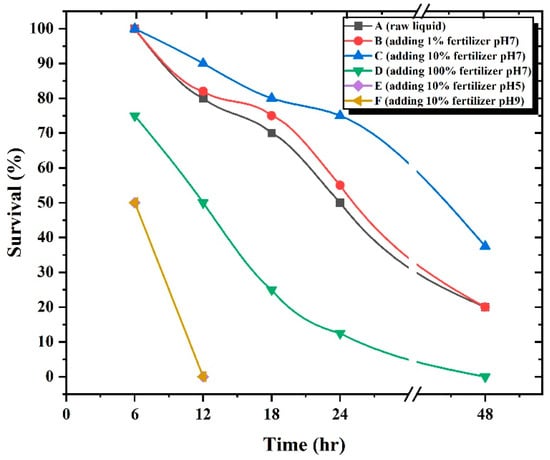 D. magna exposed to three liquid fertilizers with different pH values and concentrations over a short time (6–24 h, 48 h) are shown in Figure 6. For D. magna exposed to three concentrations (A, B, and C) the survival is 100%, but for those exposed to Liquid D the survival rate decreased by 25%, while for those exposed to Liquid E and F the survival decreased by 50% at 6 h. At 12 h exposure time D. magna exposed to Liquids A, B, and C had a survival rate of more than 80%, but for those exposed to Liquid D the survival rate decreased 50%, while for those exposed to Liquids E and F the D. magna all died. At exposure time of 18 h, D. magna exposed to Liquids A, B, and C had a survival rate of more than 70%, while for those exposed to Liquid D the survival decreased 75%. At exposure time of 24 h, D. magna exposed to Liquid C had a survival rate that approached 80%, while those exposed to Liquids A and B the survival rate is more than 50%, but for those exposed to Liquid D the survival rate is 15%. At exposure time of 48 h, D. magna exposed to Liquid C the survival rate approached 40%, while those exposed to Liquids A and B the survival rate is 20%, but D. magna exposed to Liquid D all died. Discussion of these results is in Section 4.5.