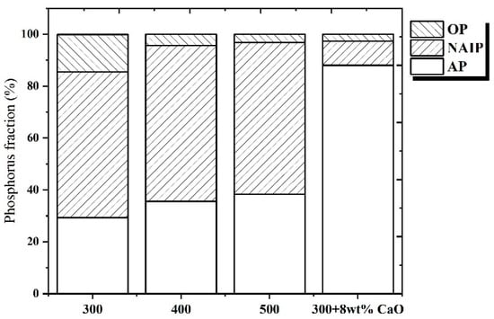 The preceding results suggest that above 100 °C, increasing the reaction temperature of the CaO–SS mixture substantially increased the conversion of OP types to AP. Higher reaction temperatures may facilitate the decomposition of OP, which is beneficial for reactions between CaO and P, thus increasing the formation of AP. In order to confirm the truth of the OP conversion to AP through addition of CaO at low temperature (300 °C) the effects of different CaO (0 wt%, 8 wt%) weight fractions and different temperatures (300–500 °C) on the fraction of each P type in the SS are shown in Figure 7. At 300 °C, the content of AP, NAIP, and OP is 29.3%, 56.2%, and 14.4%, respectively. When the temperature increases, the content of OP continues to decrease. At 400–500 °C, the content of OP approaches 0%. Zhai et al. have reported that OP is most effectively decomposed and converted into AP or NAIP at 400–600 °C [39]. According to the above results the addition of CaO can stimulate the conversion of OP, NAIP to AP at lower reaction temperatures.