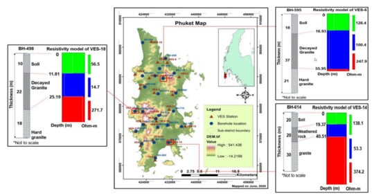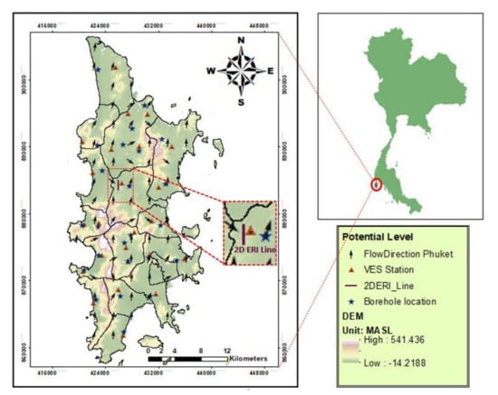 In most past studies, the groundwater potential map was not evaluated to ensure its accuracy. In this study, however, accuracy assurance was attempted with a time-lapse electrical resistivity mapping validation for the in-depth verification of a sample of a potential zone in the map. Time-lapse electrical resistivity is commonly used to show the dynamic effect of a parameter on subsurface resistivity distribution []. Because the aquifer is likely to be always saturated by groundwater, the of the high-potential zone in the dry season (December to April) is considered to be the same as in the rainy season (May to November). When the low-potential zone is found on the map, the seawater zone (acting as a natural recharge in the aquifer system) rises because of the loss of groundwater for production during the dry season. The equilibrium between fresh water in the aquifer and seawater intruding from the Andaman Sea has most likely been disrupted as a result of over-pumping of groundwater to accommodate major growth in water demand to sustain tourism in the last decade. Despite a high rate of groundwater extraction, the average groundwater level in some Phuket subdistricts gradually rose due to increased groundwater recharge, which was caused by a variety of factors including high precipitation rates, aquifer type, and seawater intrusion caused by Andaman Sea level rise [,]. On the other hand, no seasonal variation in in the time-lapse electrical resistivity in the aquifer indicates that there is a large volume of groundwater available in the high-potential area. As a result, the line survey (2D ERI line) illustrated in Figure 1 was carried out using time-lapse electrical resistivity in both dry and rainy seasons in order to demonstrate that the high-groundwater-potential area on the map is represented by no seasonal variation in .