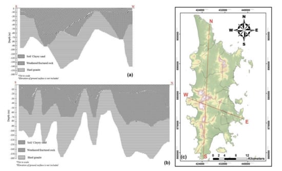 Subsurface layers in Phuket Island: (a) cross-section line E-W, (b) cross-section line S-N and (c) lines of cross-section illustration in the Phuket map (modified from Puttiwongrak et al. []).
