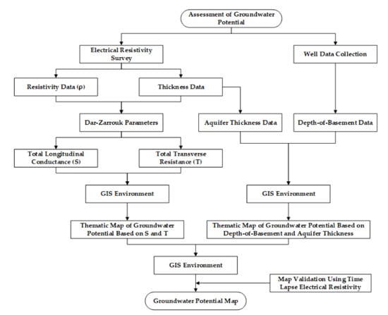A variety of ways to evaluate groundwater potential have been proposed, and among them, the geoelectrical approach has proven to be one of the most valuable tools in delineations and has been used for many applications []. In particular, electrical resistivity surveys are the most effective and efficient method for groundwater assessment and exploration []. Electrical resistivity surveys focus on the contrast between the characteristics of the target’s resistivity and the environment’s resistivity properties to assess the quantity of the target in the environment []. In Andaman Island, India, Maury and Balaji [] used borehole data to assess the accuracy of the interpretation of an electrical resistivity model to identify various hydrogeological settings of groundwater. Similarly, Owen et al. [] used related wells in conjunction with a geological map that aided the multielectrode resistivity study to evaluate the potential for extracting groundwater, and specifically for locating drilling points. Agbasi and Edet [] determined the depth to the water table, aquifer geometry, and groundwater quality by analyzing measured apparent resistivity, and the distribution of aquifer repositories was delineated through the use of the Schlumberger configuration.