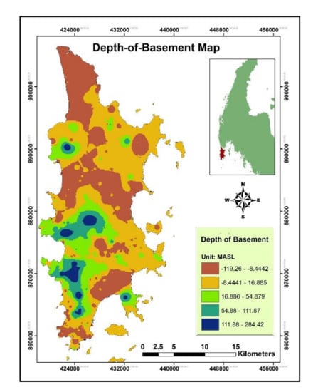 The depth-of-basement was obtained using lithologic data from boreholes conducted for groundwater production in the study region. In order to determine the thickness of the saturation zone, a depth-of-basement measurement is required. The basement depth in Phuket is relatively shallow; bedrock is found at a shallow depth of around—MASL in the northern part of the island, while it is thickest at 200 MASL in the southeast (mountainous areas). The depth-of-basement data obtained from the boreholes (Figure 1) were imported in the form of data points with a projected coordinating system of WGS 1984 UTM zone 47N datum, and then spatial interpolation was implemented as a base map using the IDW method from the GIS technique. The bulk of the bedrock of Phuket is fresh granite. Figure 5 depicts the depth-of-basement delineation in the study area. The map also depicts a mountainous area with an elevation of more than 50 MASL (blue color zones).