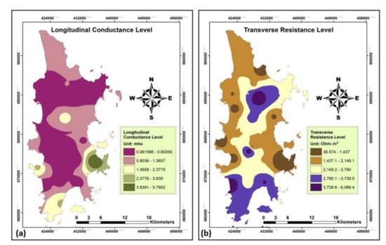 Two thematic maps of groundwater potential interpretations were used to identify groundwater potential zones. The groundwater potential map of S and total T or DZP was created using the spatial analysis extension of ArcGIS as the first thematic map, and both S and T base maps (Figure 6a,b) were combined using a weighted overlay method to construct groundwater potential mapping. During the weighted overlay analysis, each parameter of each thematic map was ranked, and weights were allocated based on the influence of the various parameters [,]. Low S areas in the groundwater potential map are connected with high T and indicate a good potential in the zone []. The variation of S and T in hard rock reflects the predominance of resistive and conductive zones in the formation above the bedrock, signifying the groundwater potential. S is defined by the ratio of and of a layer, whereas T is defined by the product of and of a layer. The Equations (1) and (2) from Mailet [] were used to compute S (mho) and T (ohm-m2), respectively.