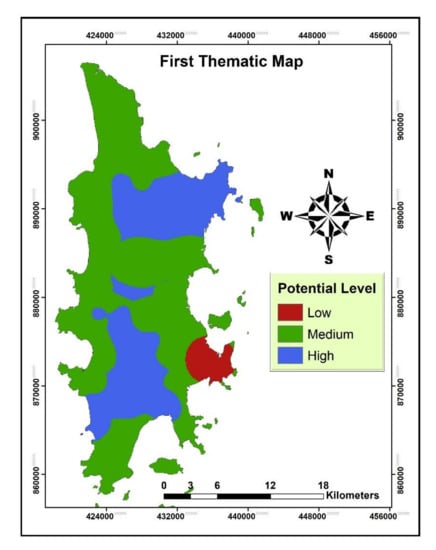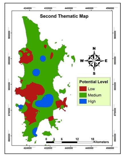 Finally, based on the weighted overlay analysis of both the first and second thematic maps, a Phuket groundwater potential map was constructed using DZP, depth-of-basement, and aquifer thickness data. The weighted overlay reclassifies values in input rasters onto a similar suitability evaluation scale, assigning a relative importance to each and adding them together for the same weight (50%) to obtain a suitability value for each point on the map.