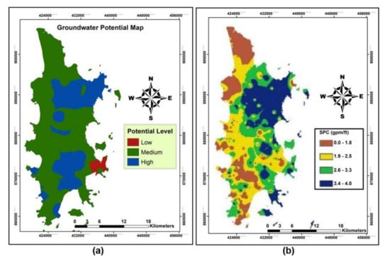 The integrated geoelectrical inquiry and hydrogeological analysis with aids of GIS techniques gave a useful outcome for groundwater potential mapping and sustainable planning. The map can be used to help future groundwater developments, management practices, and cropping patterns. The map created in this study shows a substantial correlation with and certain similarities to the previous map of Charoenpong et al. [], as shown in Figure 10b, but the map created in this study reveals the comfortable details and updated version of the groundwater potential map, which is well expected to provide a broader and more accurate understanding of favorable groundwater potential areas. Figure 10 shows comparative zones of high potential (blue color zones), where production times (time differences between two maps) and seasonal effects are not dominant, which are in good agreement with each other.
