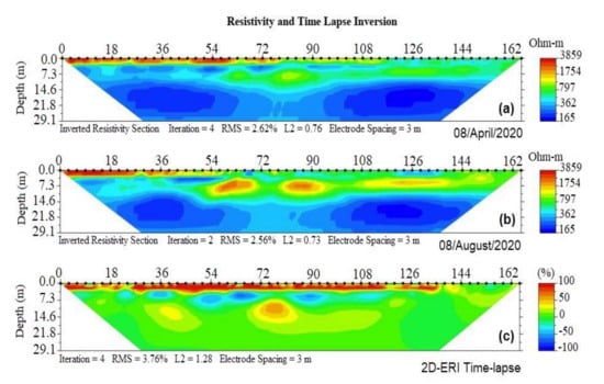 The inverted results of 2D-ERI profile: (a) 2D ERI survey in dry season on 8 April 2020, (b) 2D ERI survey in rainy season on 8 August 2020 and (c) time-lapse inversion indicating the percentage change of the resistivity value between dry and rainy seasons in a high-potential zone for Phuket groundwater potential validation.