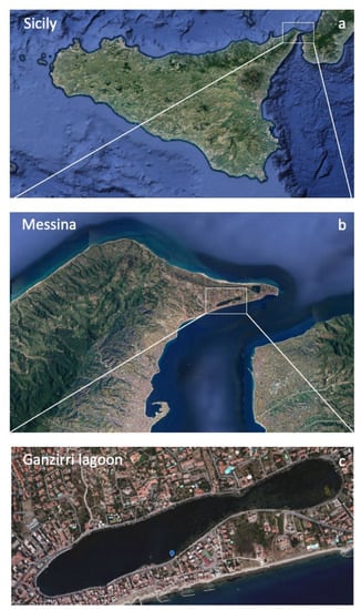 In particular, the sampling location, Ganzirri Lagoon, is a brackish pond continuously in communication with the Strait of Messina through the “Due Torri” and “Carmine” Channels and with Faro Lake through the Margi Channel [54,55] (Figure 1b). The water level of this basin is not stable, as it is affected daily by the Strait of Messina tidal currents that change every 6h regularly, raising and lowering the level of the lagoon water [53].