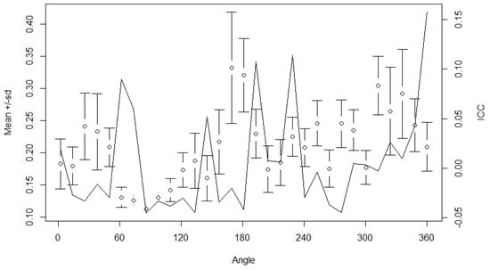 Mean and standard deviation (SD) of wavelet coefficients for all combined otoliths and the proportion of variance among species (black line). The horizontal axis shows angle in degrees (°) based on the polar coordinates of mean shapes of left otolith contours. The centroid of the otolith is the centre point of polar coordinates.