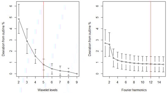 Plotting the quality of wavelet and Fourier outline reconstruction. The red lines indicate the level of wavelet and number of Fourier harmonics needed for a 98.5% accuracy of the remodelling.