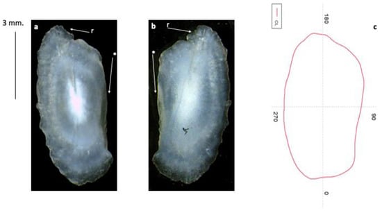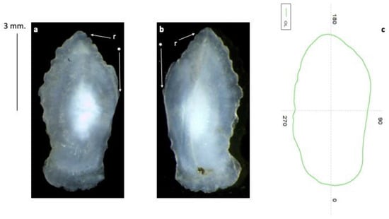 Left sagittae of Chelon labrosus with scale bar. (a) Medial view; (b) lateral view; (c) mean shape; (r) indicates the rostrum, and (*) indicates the dorsal rim.