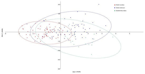 Linear Discriminant Analysis (LDA) of the sulcus acusticus computed between the species Chelon auratus, Chelon labrosus and Oedalechilus labeo. The LDA was based on selected sulcus acusticus parameters: sulcus acusticus area, sulcus acusticus perimeter, sulcus acusticus length, ostium area, ostium perimeter, ostium length, ostium width, cauda area, cauda perimeter, cauda length, cauda width, percentage of the otolith surface occupied by the sulcus (SS/OS, %), percentage of the sulcus length occupied by the cauda length (CL/SL, %) and percentage of the sulcus length occupied by the ostium length (OSL/SL, %). 95% probability ellipses are shown.