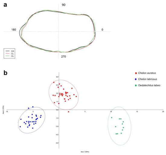 The mean shape of otoliths differed significantly between the C. auratus, C. labrosus and O. labeo specimens (p < 0.001). The otolith contours are shown in Figure 8a. Marked differences in otolith shape have also been confirmed by LDA. From the LDA plot of the first two discriminant functions, we can see that the three species were quite well separated (Figure 8b).