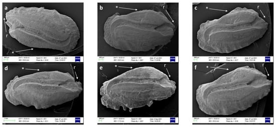 SEM imaging of the left sagittae proximal surface; (a–d) Chelon auratus; (b–e) Chelon labrosus; (c–f) Oedalechilus labeo; (r) indicates the rostrum, and (*) indicates the dorsal rim.