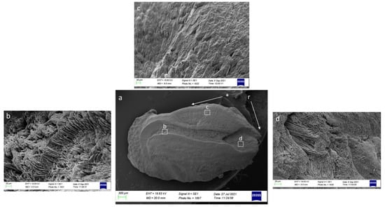 SEM imaging of left sagitta proximal surface in Chelon labrosus (a) with details of external textural organization of cauda (b), dorsal area (c) and ostium (d); (r) indicates the rostrum, and (*) indicates the dorsal rim.