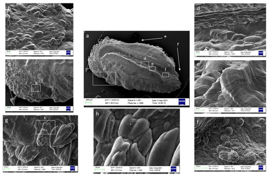 SEM imaging of left sagitta proximal surface in Chelon labrosus (a) with details of several calcium carbonate habits in posterior area (b), ventral area (c–h), cauda (d,e) and ostium (f); (r) indicates the rostrum, and (*) indicates the dorsal rim.