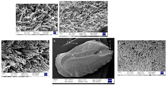 Concerning the external textural organization, SEM analysis highlighted a polymorph transformation, strictly related to the otoliths’ mineralization process. All the analyzed sagittae showed radial oriented crystalline units, which had a chaotic orientation and were not equally sized (Figure 10a–e, Figure 11a–c and Figure 12a–c), probably due to the polymorph composition of the crystals. In all the studied species, the aragonite was found in two crystal habits (columnar habits and distinct plate habits) on the cauda surface with bigger, longer and narrower crystals (Figure 10d,e, Figure 11b and Figure 12c–e), while in the ostium, they were smaller and shorter than in the cauda, with a smooth surface (Figure 10b, Figure 11d and Figure 12b).