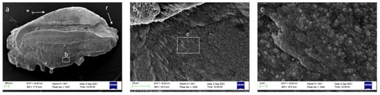 SEM imaging of left sagitta proximal surface in Chelon labrosus (a) with details of granular crystalline habit in ventral area (b,c); (r) indicates the rostrum, and (*) indicates the dorsal rim.
