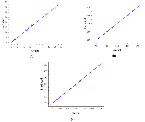 The reliability of the RSM function model can be verified according to the significance F-value test and analysis of variance of the regression model. Table 3 lists the results of this model. The p-value is used to verify the significance of the regression coefficients. When p < 0.05, it indicates that the influencing factor is significant. As shown in the data of analyzing variance (ANOVA) in Table 3, the p-values of “model” were less than 0.0001, indicating that the regression effects were very significant. This model can be used to predict the property of grouting materials. The scatter plots of measured and predicted values of grouting material properties (Figure 2) show that the scattered points are distributed near the straight line, indicating that the data fit well. From the above analysis, it can be concluded that the predicted value of the model was very consistent with the actual value, and that the model has high reliability and a good fitting effect.