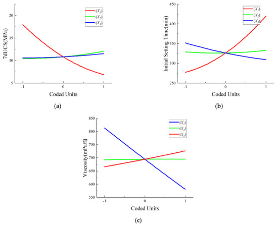 Effect of response surface parameters on (a) 7dUCS, (b) initial setting time, and (c) viscosity of materials. (Controlling other variables, coded values of w/c (X1), silica fume content (X2), and sodium silicate content(X3) are all 0).