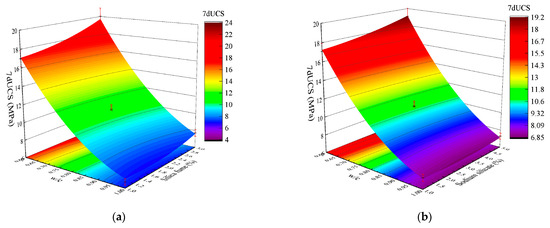 The p-value of both X1 X2 and X1 X2 were smaller than 0.05 for 7dUCS in ANOVA results (Table 3), indicating that 7dUCS was significantly influenced by the reaction between w/c (X1) and silica fume content (X2), as well as the interaction between w/c (X1) and sodium silicate content (X3). Figure 4 shows the 3D response surface plots of X1 X2 and X1 X3, where the red indicates that the 7dUCS is high and the blue indicates low 7dUCS. The reduction rate of 7dUCS slowed down after the actual value of w/c exceeded 0.8. The response surface gradually flattened with the increase of w/c, which is consistent with that in Figure 3a. As mentioned above, both silica fume and sodium silicate could increase the 7dUCS. However, with the increase of w/c, the decrease of slurry concentration leads to the decrease in the amount of C-S-H, which results in the weakening of their reinforcement effect on 7dUCS.