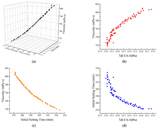 Pareto solutions with NSGA-II on (a) 7dUCS, initial setting time, and viscosity; (b) 7dUCS and viscosity; (c) initial setting time and viscosity; (d) 7dUCS and initial setting time.