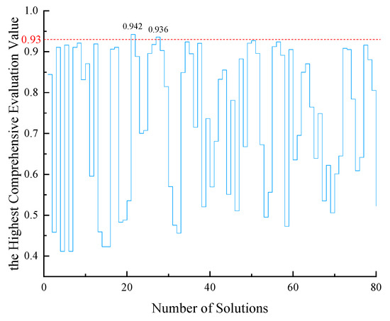 According to the research of Taboada [40], 5000 iterations are enough to realize the determination of the solutions as the NNRP method is used to determine the optimal solutions for three or four attributes. In this paper, the maximum iteration number was set to 5000 when preparing the optimal solutions for fly ash grouting material. The determination results are shown in Figure 6. The horizontal axis is the serial number of the solutions and the vertical axis is the highest comprehensive evaluation value of the solutions. The blue line shows the variation of the highest comprehensive evaluation value of different solutions, while the red line is plotted to highlight the optimal solutions. Two solutions are above 0.93. They are No. 21 with the highest comprehensive evaluation value of 0.942, followed by No. 27, with the highest comprehensive evaluation value of 0.936. The two solutions were selected as the optimal solutions and their relevant parameters are shown in Table 4. The 7dUCS of the two solutions are almost equal, the initial setting times are about 305 min, and the viscosities are less than 740 mPa·s.