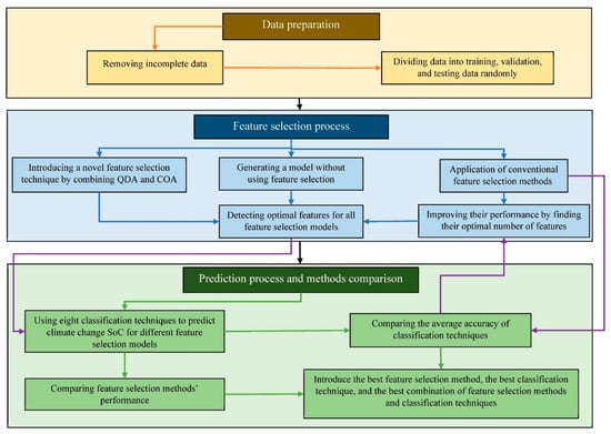 The methodology flowchart is illustrated in Figure 1. As can be seen, the first step of this research was data preparation. Afterward, the proposed feature selection technique (COA-QDA) was developed. Then, different feature selection techniques were applied, and their performance was improved using classifier average prediction accuracy. A model without applying feature selection (i.e., using all features) was used to evaluate the effectiveness of feature selection methods on prediction accuracy. In the next step, the variables resulting from the different feature selection methods were employed to predict CC-SoC using eight classification techniques. Accordingly, the performance of feature selection techniques and classifiers were compared. The best combination of feature selection and classification techniques was determined, and its optimal features were applied in a proposed sensitivity analysis to prioritize the optimal features.