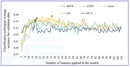 Initially, conventional feature selection techniques were ran, and feature importance weights were obtained. Then, the optimal number of features were tested incrementally from 2 to 110 by decreasing value of importance weight. All classifiers were run, and the average value of validation data accuracy was calculated for each possible optimal number of features and for each conventional feature selection technique. The results of this analysis are shown in Figure 2. As can be seen, the optimal number of features for RFFS, ETFS, Lasso, EN, and PCA were 18, 19, 16, 35, and 17, respectively. A more detailed look at this graph reveals that the applied method enhanced the performance of feature selection techniques, even for EN and Lasso that already determine the optimal number of features. The average accuracy of classifiers for EN and Lasso features were increased by 2.8% and 0.8% respectively by considering the introduced improvement to find the optimal number of features. Therefore, it can be inferred that the conventional versions of Lasso and EN do not present the optimal number of features if the introduced improvement technique is overlooked in their process. Additionally, these versions of RFFS, ETFS, and PCA can present the optimal number of features. It should be noted that there is not a direct correlation between increasing the number of features and an increase in the prediction accuracy. By increasing the number of features, the accuracy was increased until a threshold, and afterward, it reduced for all feature selection techniques. Thus, applying the improved versions to find the optimal number of features for conventional feature selection techniques in problems with a high number of features could be vital.