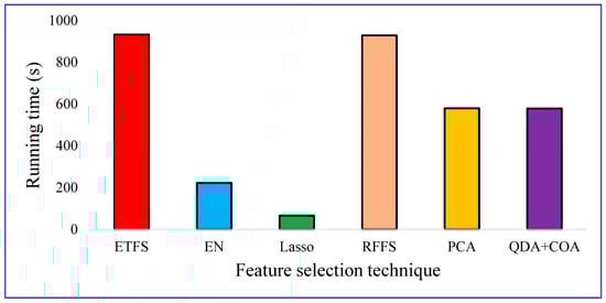 - Lasso is the fastest feature selection method regarding the average running time, followed by EN, COA-QDA, PCA, RFFS, and ETFS.