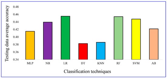 - The average testing data accuracy of LR, RF, SVM, NB, AB, MLP, KNN, DT is 45.5%, 45.4%, 44.8%, 43.9%, 42.2%, 41.5% 38.6%, and 38.3%, in the order given. Therefore, in this study LR and RF outperformed other classifiers based on the average prediction accuracy.