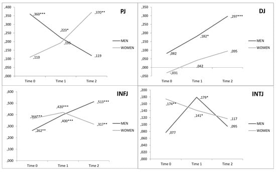 Means and standard deviations for all study variables by gender at the three time points are presented in Table 1. In terms of gender differences, males obtained significantly greater scores in PJ and DJ at Time 0; in PJ, DJ, INFJ, and INTJ at Time 1, and no differences at Time 2. Regarding the evolution over the season, all variables had significantly lower scores at Time 2 than at Time 0. Men showed a large decrease in their values, while women’s values decreased less, especially between Times 1 and 2.
