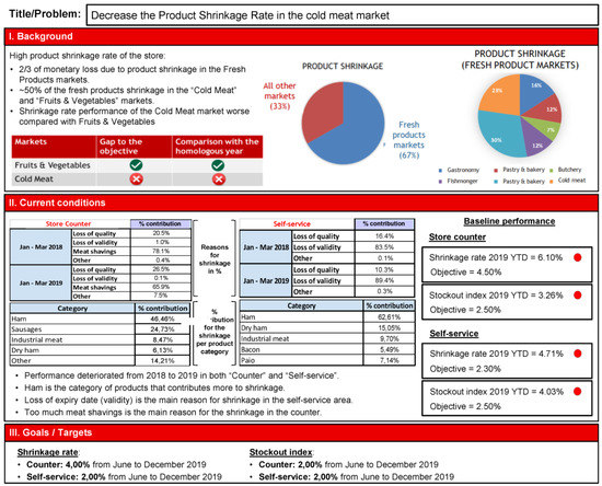 The case study focuses on one store of a multinational corporation in the retail sector located nearby Lisbon, in Portugal. With more than 70 stores in the country, the corporation employs around 9000 people. The hypermarket store is a medium-large format type with an area of around 7000 square meters. In 2019, the company was developing a strategic pilot initiative with the aim of implementing a lean green daily management program. This program aimed to improve operational key performance indicators, and, in parallel, to increase sustainability metrics. Due to their importance for the overall sustainability results, the improvement efforts targeted the markets under the fresh products department. The metrics studied in this particular study were the “shrinkage rate”—directly responsible for both food and operational waste—and, as a complementary metric, due to its strong correlation, the “out-of-stocks index”.