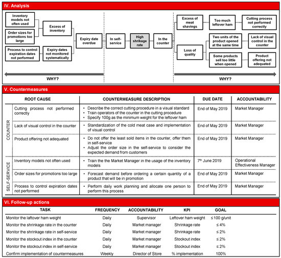 Collected data allowed for the store to understand that the highest levels of product shrinkage were in its fresh products markets, particularly in two areas: fruits and vegetables (F&V) and cold meat. The F&V market performed satisfactorily, since the shrinkage results were better than both the objective and in comparison with the previous year. On the contrary, the store performed poorly regarding this food waste indicator in the cold meat market, with a shrinkage rate far from the stated objective, as well as from the previous year’s performance. These facts were recorded in advance in the “Background” field of the A3 report (Figure 2). The scope was therefore defined: decrease the shrinkage rate in the cold meat market.